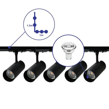 Beschrijving Complete Set 1-Fase Rail L 1 x 1,5 Meter Zwart | incl. 5x Spot + GU10 2700K 3W Dimbaar + Eindkap, Voedingsconnector en L -Verbindingsstuk