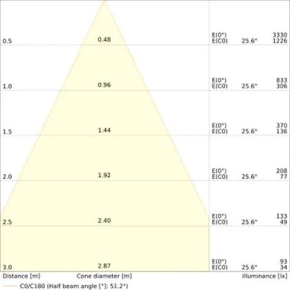 De lichtopbrengst en de gradenbundel spelen een grote rol. Zo geeft de lichtopbrengst van 840 Lumen in combinatie met de 60° stralingshoek deze inbouwspot een specifieke toepassing. Kort samengevat is een lichtintensiteit van maximaal 400 Lumen ideaal voor accentverlichting, terwijl hogere waardes goed gebruikt kunnen worden als basisverlichting. Over het algemeen geldt: hoe breder de gradenbundel, hoe geschikter deze is door basisverlichting. Dit komt doordat het licht over een groter oppervlak wordt verspreid. Smallere gradenbundels (tot 40°) kunnen echter bij hoge plafonds ook goed tot hun recht komen als algemene verlichting.