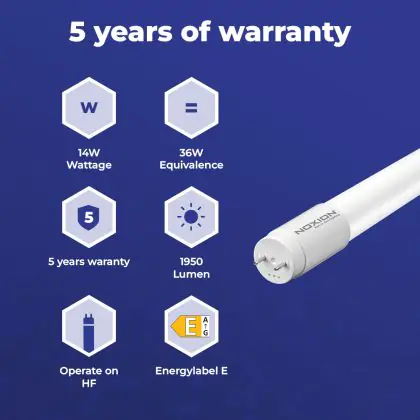Deze Noxion LED TL buis heeft een Lumen / Watt efficiëntie van lm/W. Dit is de waarde die je verkrijgt door de lichtopbrengst (1950 Lumen) te delen door het wattage (14W) van deze lichtbron. Hoe weet je of jouw lichtbron een goede efficiëntie heeft? In dit geval ligt de lm/W waarde boven de 65. Je kunt er ook voor kiezen om een LED geïntegreerd TL armatuur te kopen. Hierbij heb je de keuze uit diverse (waterdichte) LED montagebalken, die in een divers aantal Lumen verkrijgbaar zijn. Een (dimbaar) LED paneel is ook een slimme optie, met name voor ruimtes met een systeemplafond (eenvoudige installatie) en kantoren (UGR<19 varianten).