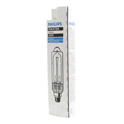 SOX E 18W van Philips is een lagedruk natriumlamp. Dit is de meest efficiënte gasontladingslamp op de markt, dat houdt in dat u het meeste licht krijgt per watt dat deze lamp verbruikt.